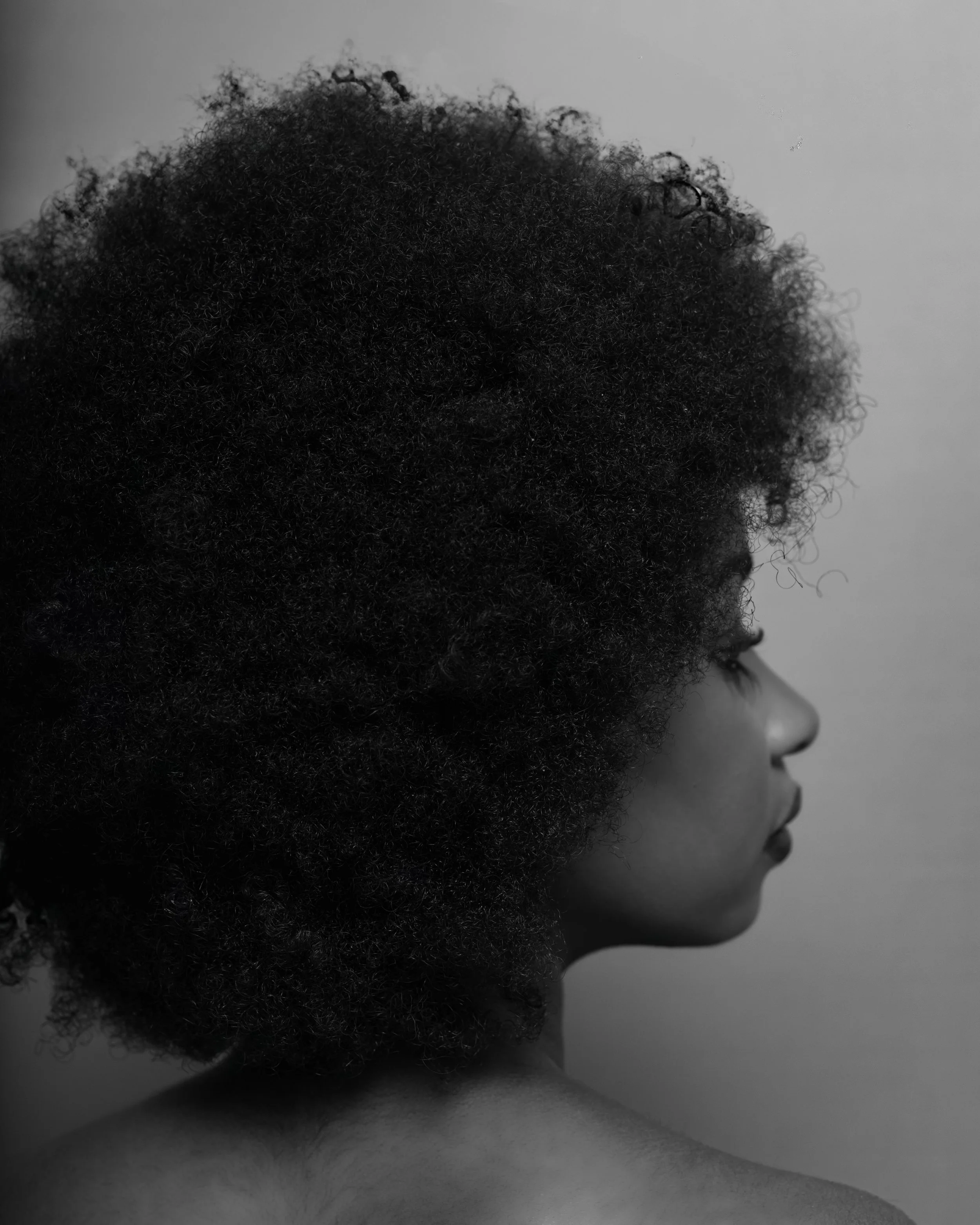 Side profile of a woman with natural, curly afro hairstyle in black and white.