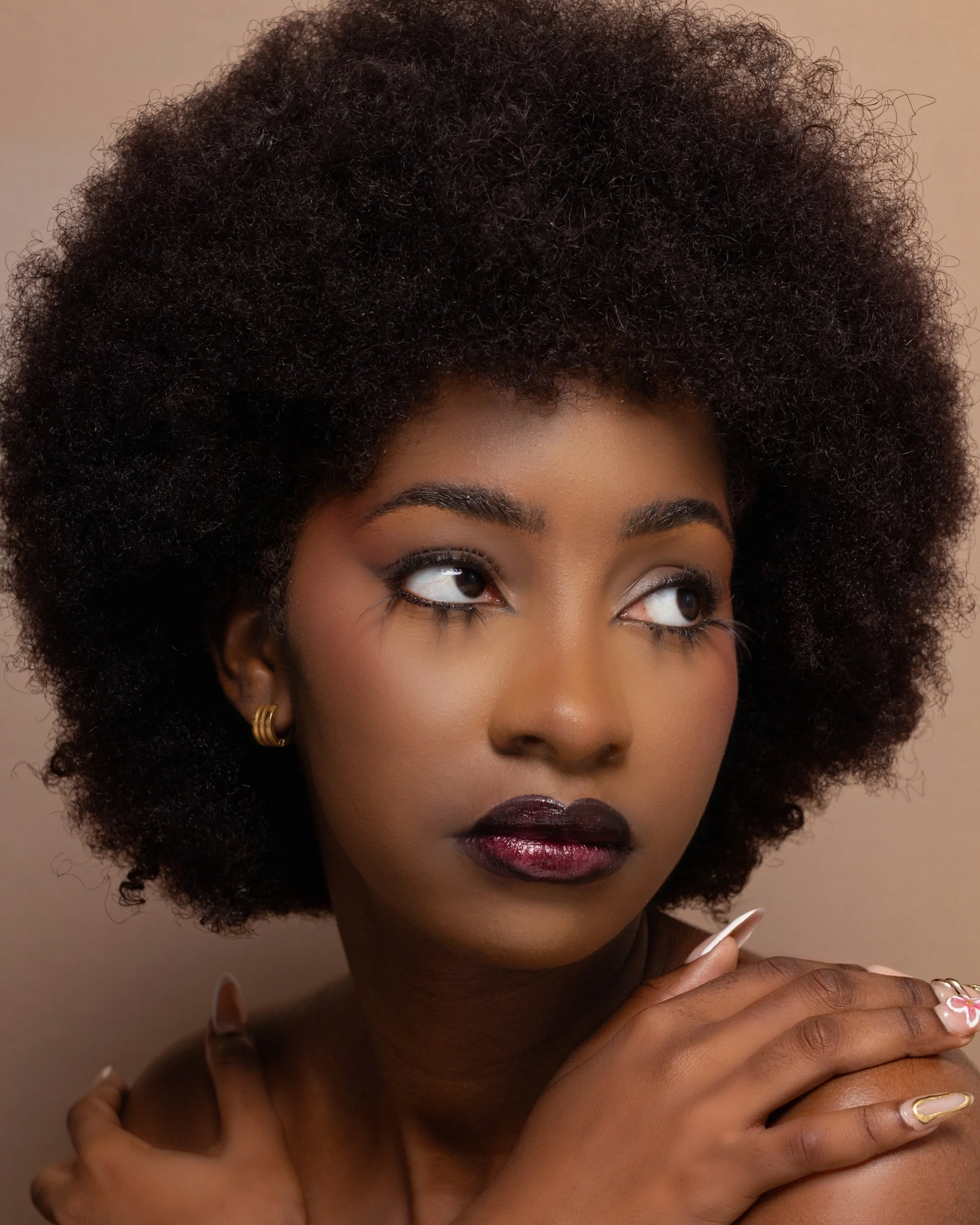 Close-up portrait of a woman with natural curly hair, dark lipstick, and bold makeup, looking to the side with her hand resting on her shoulder.