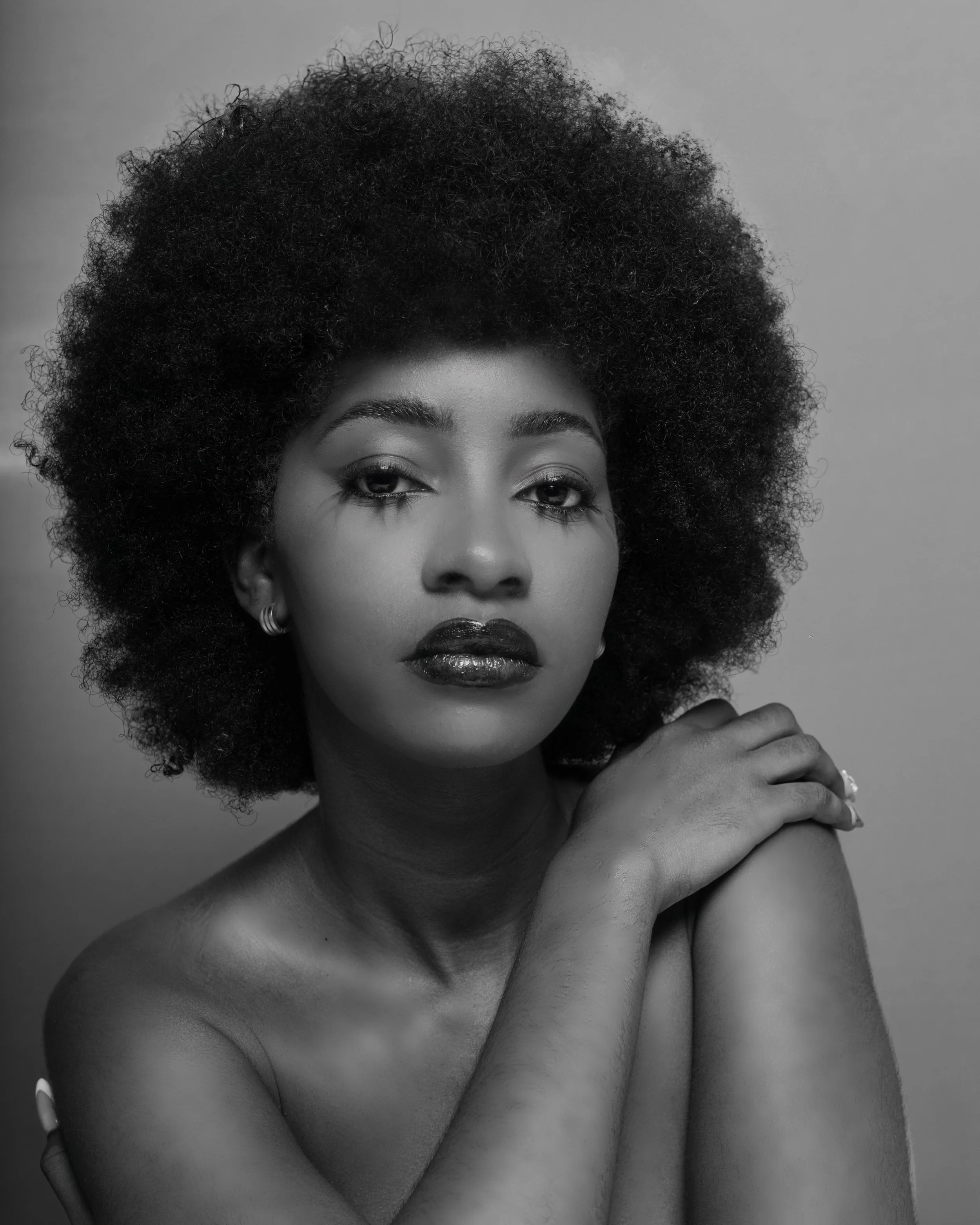 Black and white portrait of a woman with curly hair, bold lips, and wearing earrings, looking at the camera with her hand resting on her shoulder.